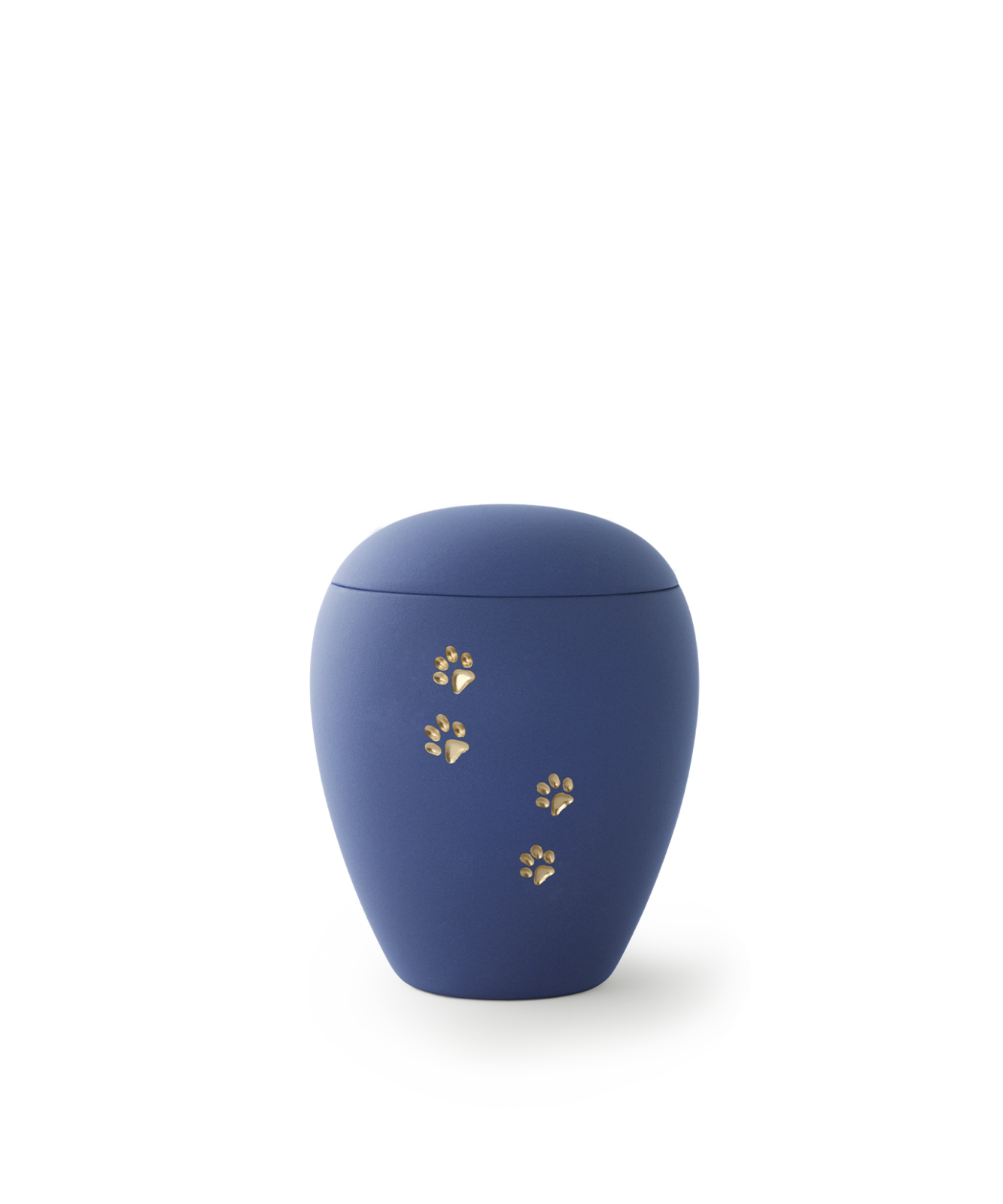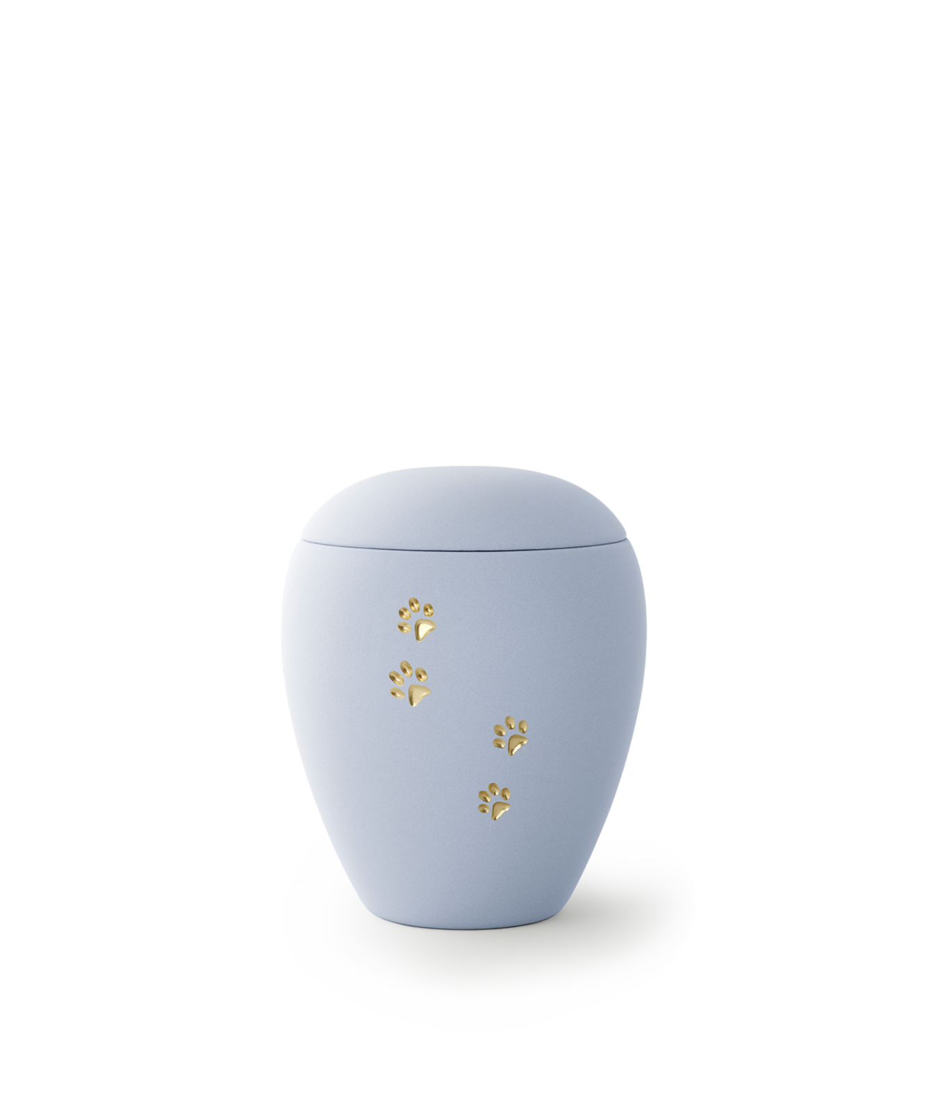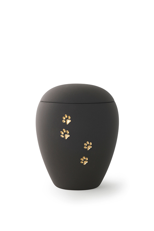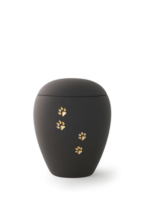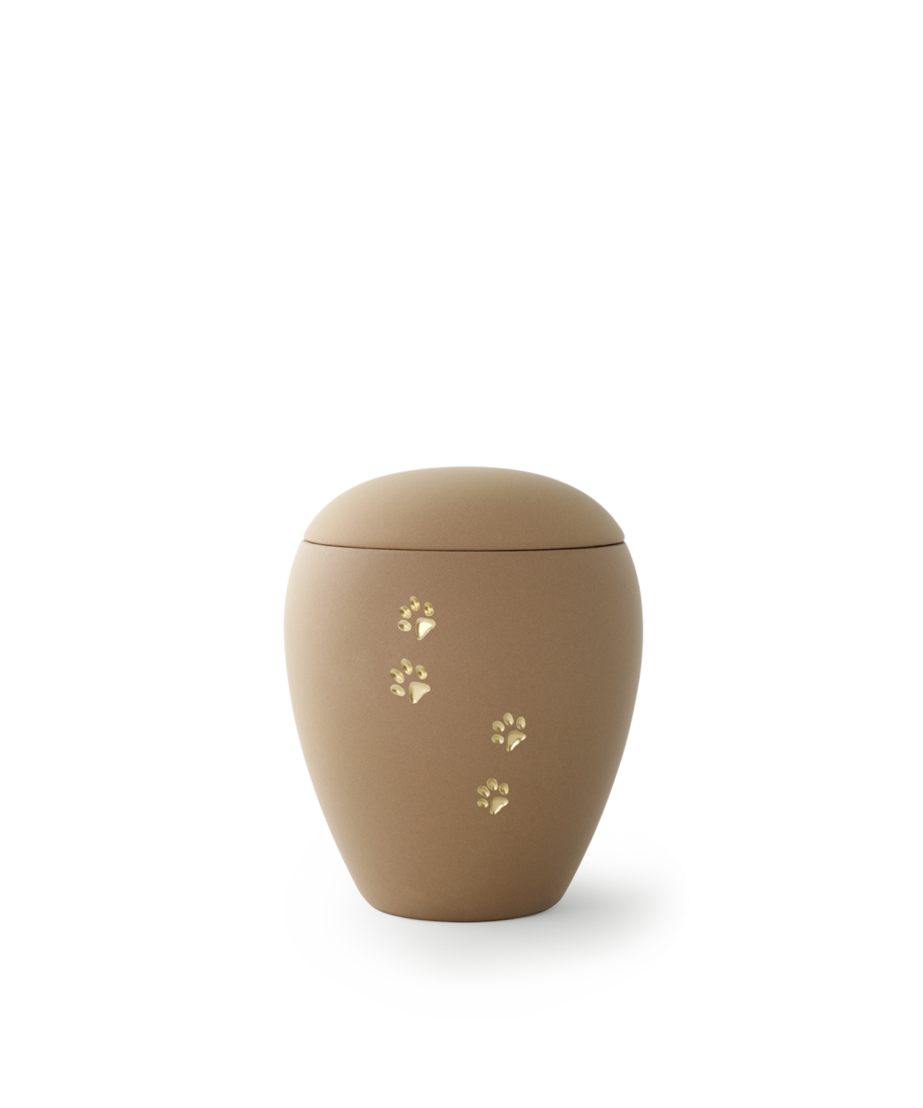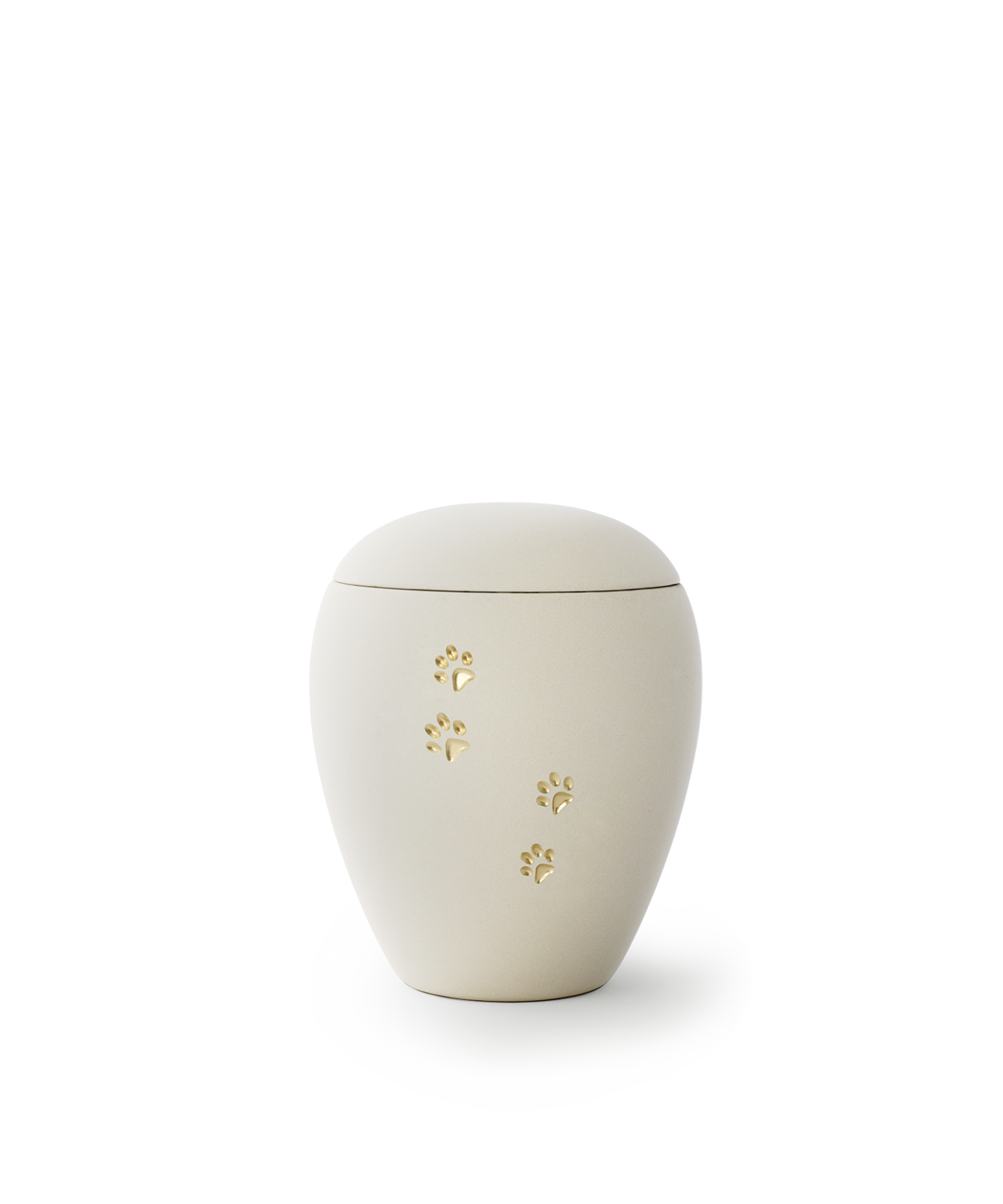 Die hier sichtbare Verzierung mit 4 goldenen Pfötchen verleihen dieser Urnenausführung eine besondere Note und sind eine Symbolik für die Pfotenspuren, die unsere verstorbenen vierbeinigen Freunde in unserem Herzen hinterlassen haben.