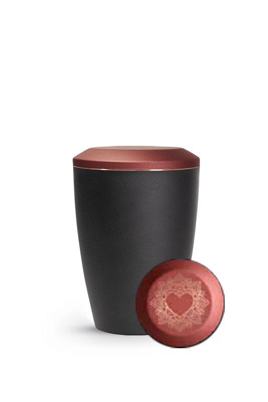 Verziert werden diese mi einem gebürsteten Kupferstreifen und einem Mandala, welches auf dem flachen Decken der Urnen besonders gut zur Geltung kommt.