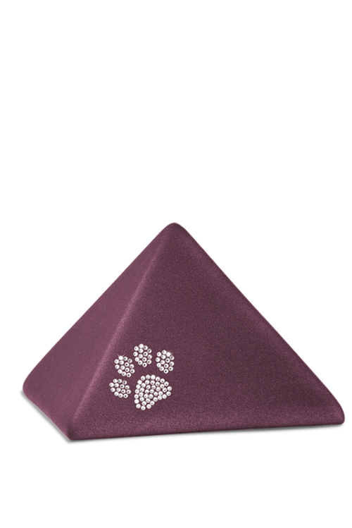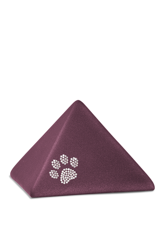 Charakteristisch für die Keramikurnen der Edition Pyramide ist eine matt schimmernde Velvet Oberfläche. Die Pyramiden sind wahlweise mit vier kleinen, in Gold glänzenden Pfötchen oder einer großen Pfote aus Kristallen erhältlich. Ein wunderschönes Farbspektrum rundet das Angebot dieses Modells ab.